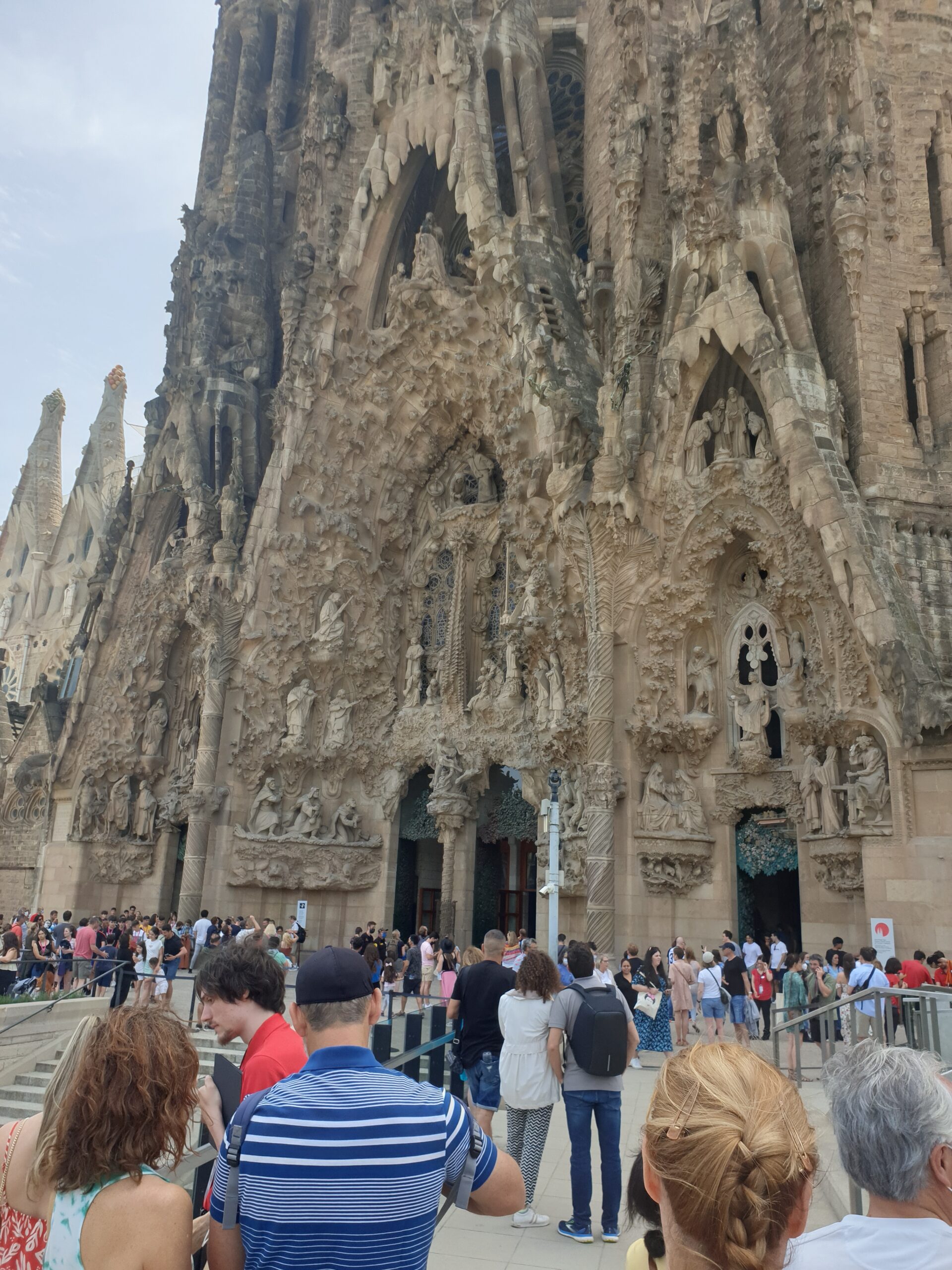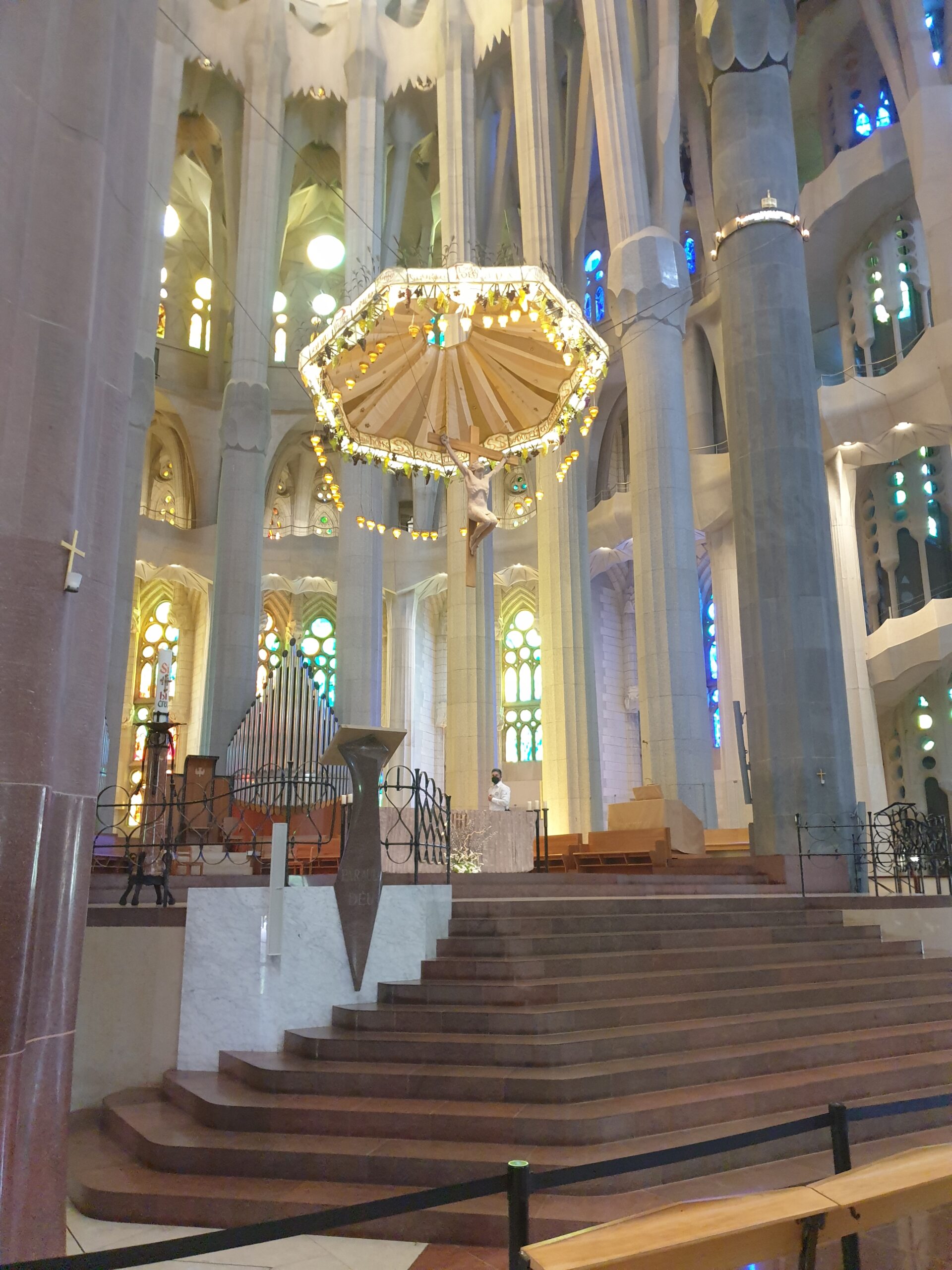 Ne indreptam pe jos spre al doilea obiectiv legat de Gaudi. Este vorba desigur de catedrala La Sagrada Familia. Inceputul constructiei dateaza din 1882. Dar nu este terminata nici in ziua de astazi. Este opera de capatai a marelui arhitect, care si-a dedicat ultimii 15 ani din viata finalizarii acesteia. Si chiar moartea sa este legata de catedrala. Caci marele Gaudi se indrepta spre santier cand a fost lovit de un tramvai. Fiind imbracat modest a fost confundat cu un cersetor si a zacut minute in sir pe caldaram. Pana la urma a fost transportat la un spital public. Dar a murit dupa doua zile. Si a fost inmormantat unde altfel decat in catedrala! Patrundem spre catedrala parcurgand un parculet superb. Din motive de pandemie nu se poate intra decat cu bilete achizitionate on-line. Accesam situl https://sagradafamilia.org/en/ si facem rost rapid de bilete.