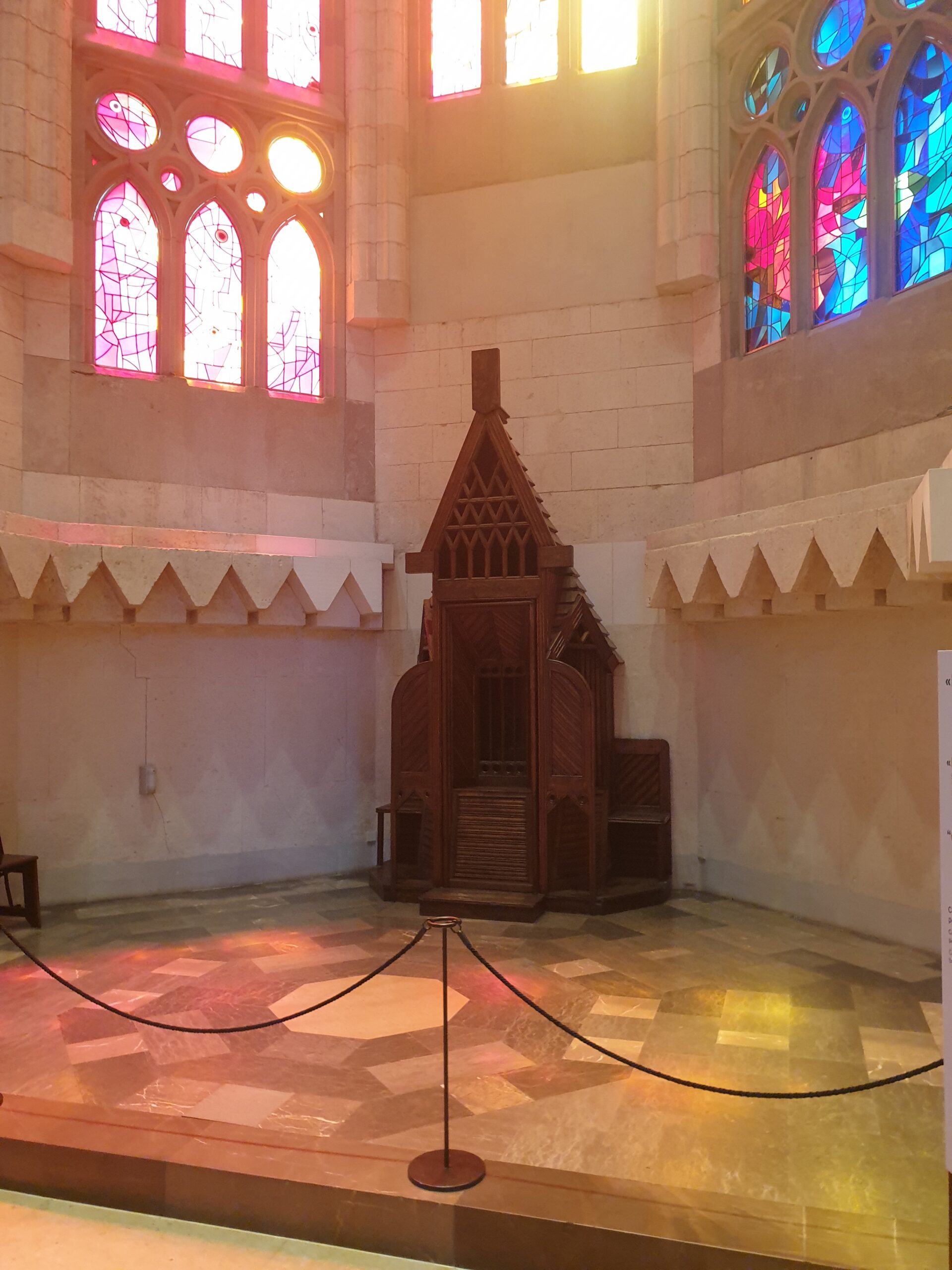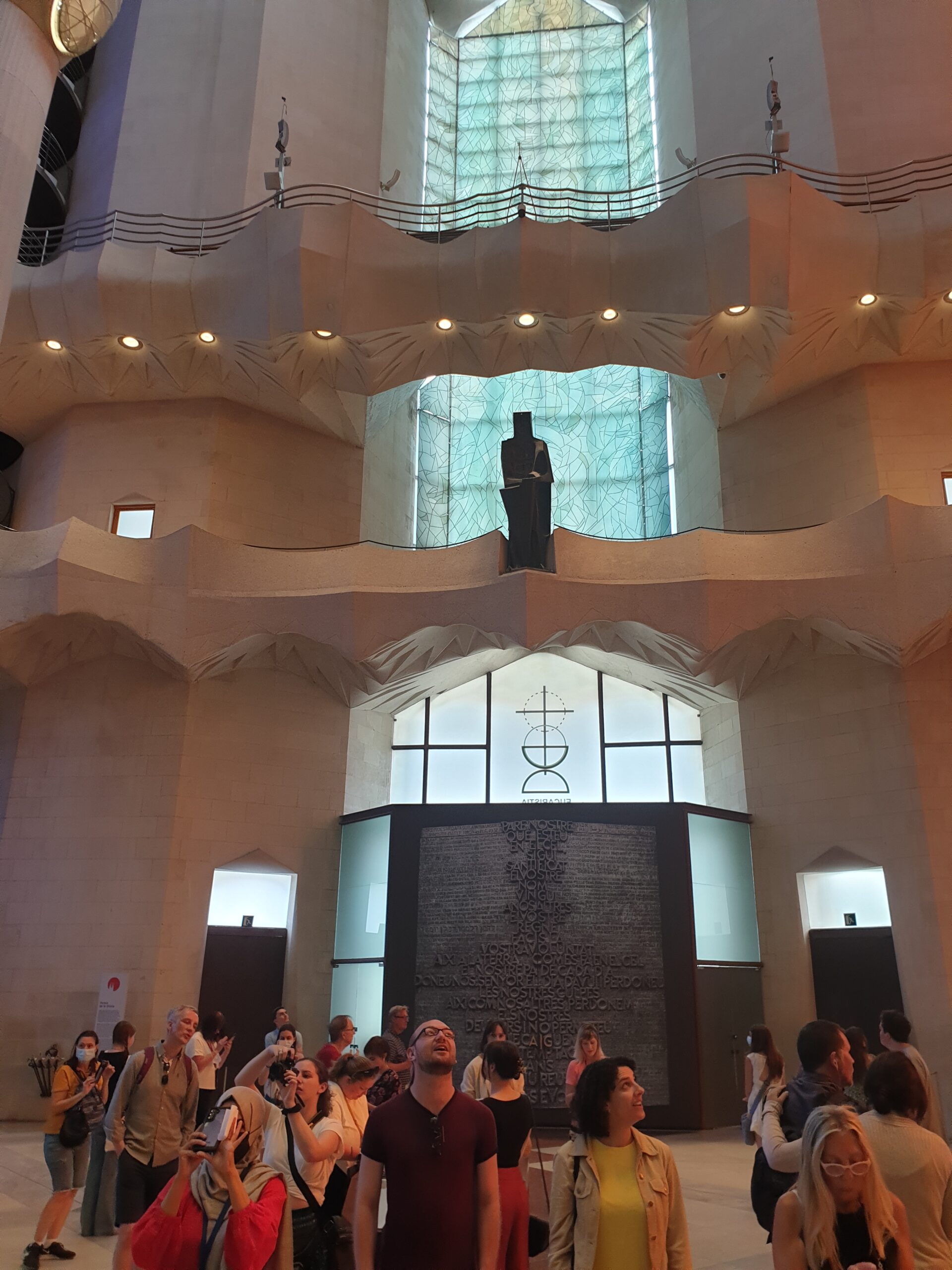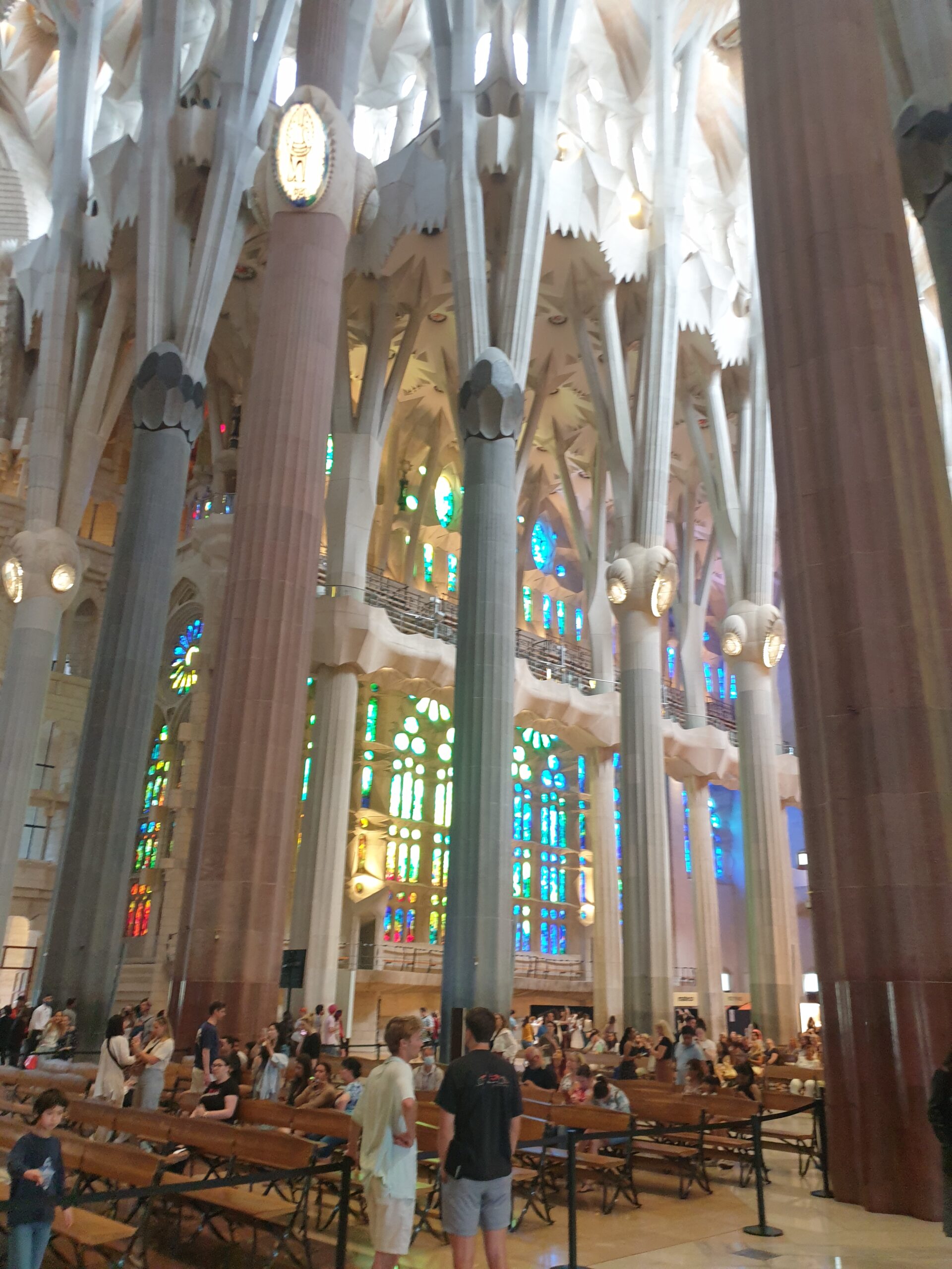 Cum nu avem prea mult timp la dispozitie alegem doar intrarea in catedrala, fara urcat in turn. Trecem printr-un sistem de securitate ca la aeroport. Patrundem in sfarsit in curtea catedralei. Admiram turnurile maiestuoase, inalte de 170 metri. Intelegem si de ce constructia a ramas neterminata. Pe fatada si pe turnuri sunt milioane de decoratii. Care par jocul unui copil ce construieste un castel de nisip. Interiorul contrasteaza insa puternic. Pare extrem de simplu, cu exceptia poate a scarilor. Care serpuiesc incredibil spre cer… Dar are o luminozitate aparte, care contrasteaza cu intunecoasele catedrale gotice medievale. Luminozitate asigurata de vitraliile superbe. Statuile sfintilor apostoli si evanghelisti par foarte moderniste. Parca ar fi opera unui alt fiu genial al Barcelonei. Adica Picasso! Catedrala are si o cripta, cam in genul Sfantului Petru de la Roma. Dar si un muzeu la subsol. Cu amanunte despre viata si opera lui Gaudi.