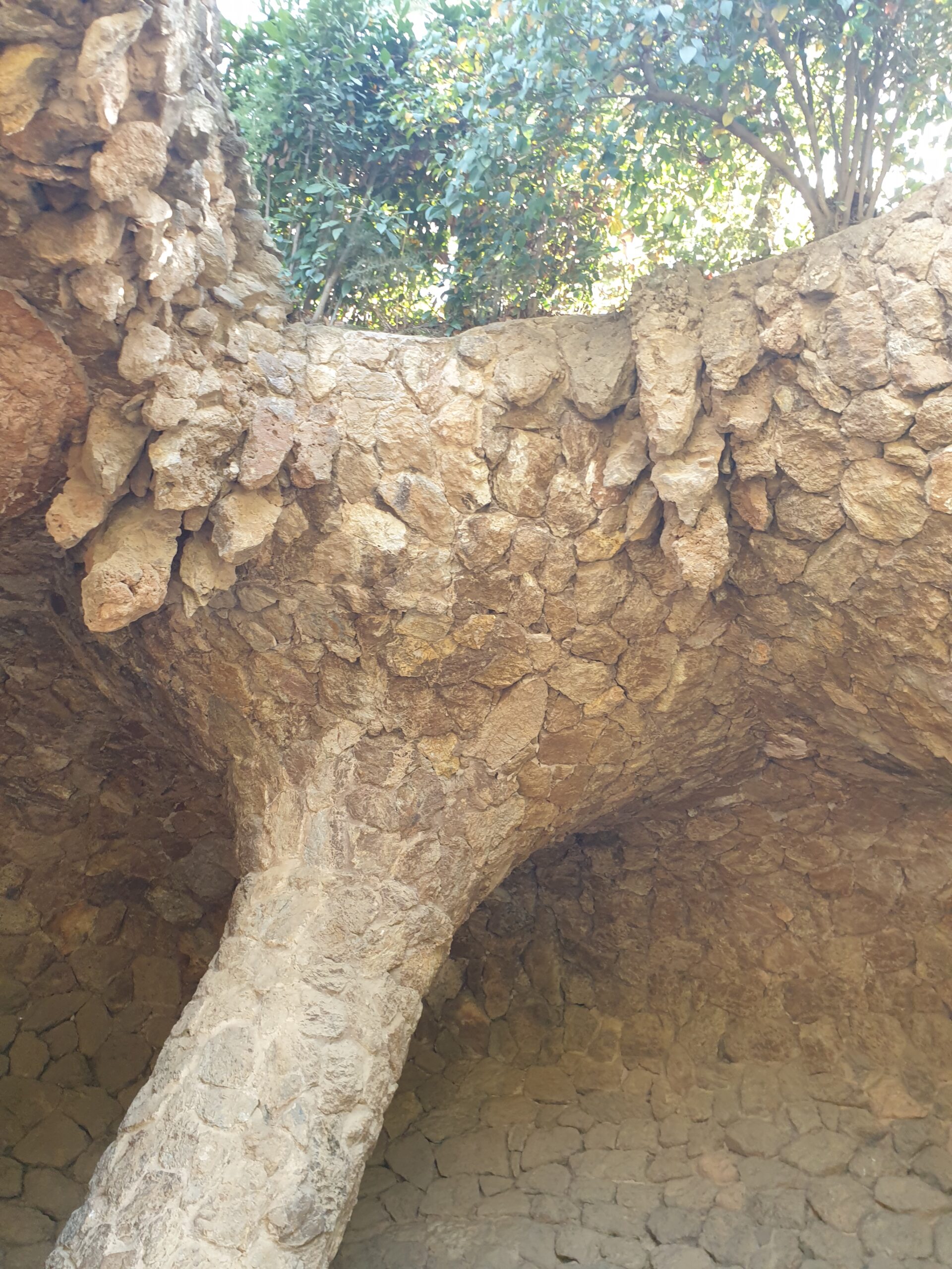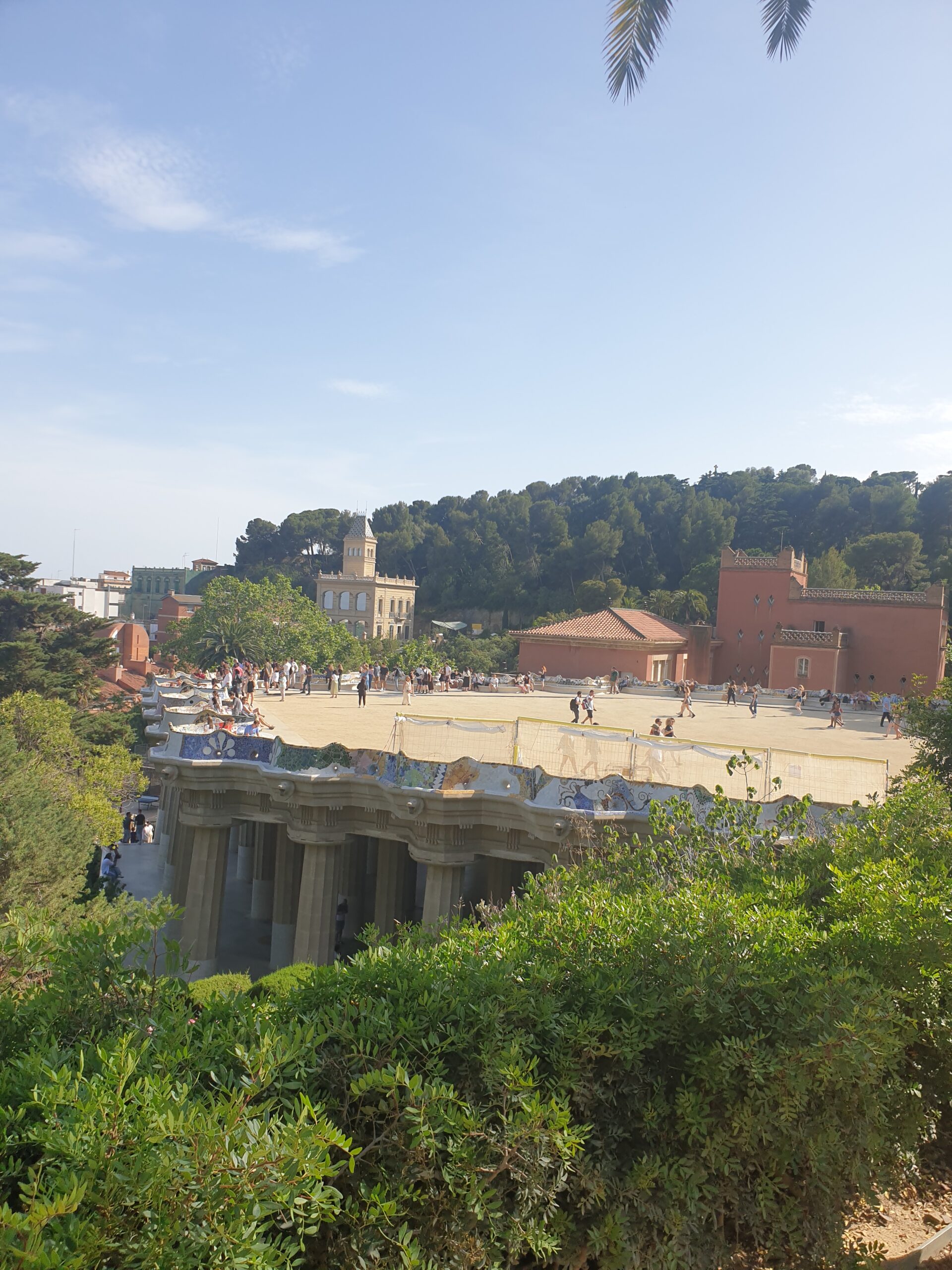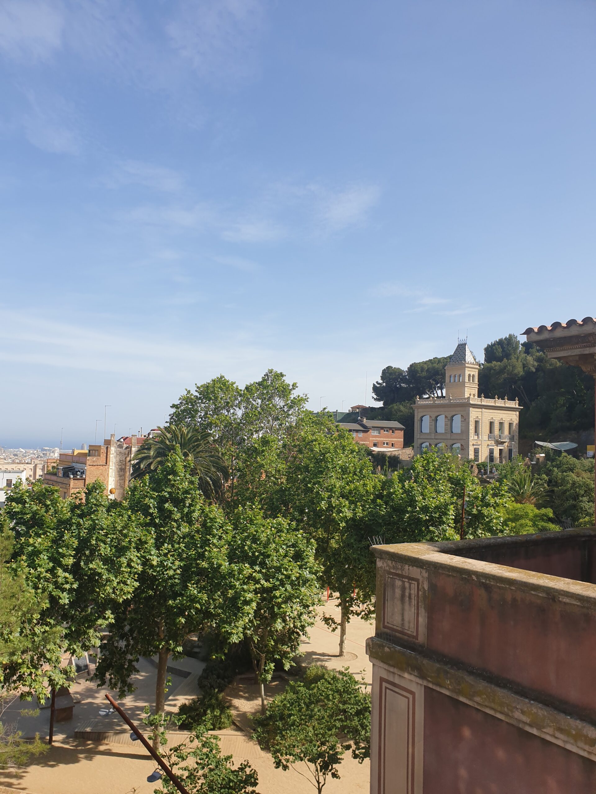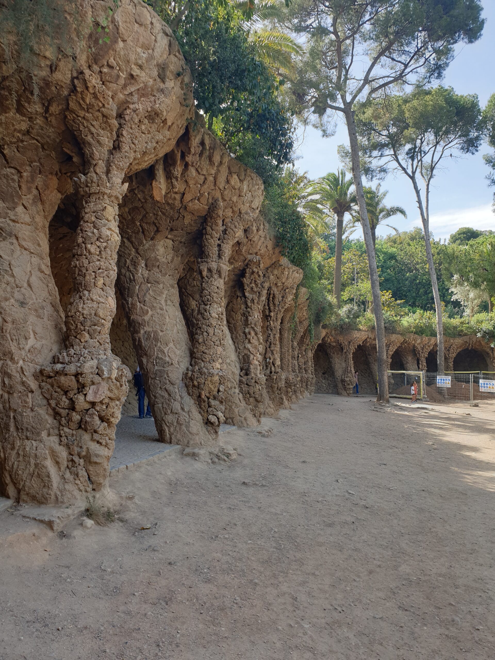 Al treilea obiectiv legat de Gaudi este parcul Guell. Construit de Gaudi intre 1900-1914. Este parca mai greu accesibil, de la statia de metrou trebuie sa urci ceva pe stradute intortocheate. Dar este si un autobuz intre statia de metrou si intrarea in parc. In parc te asteapta o lume de basm. O alee cu trunchiuri contorsionate de copaci… din piatra. Casute de turta dulce ca in povesti. Pentru a accesa point-viewul principal trebuie sa ocolesti prin parc. Dar odata ajuns acolo se deschide o perspectiva fantastica asupra orasului.