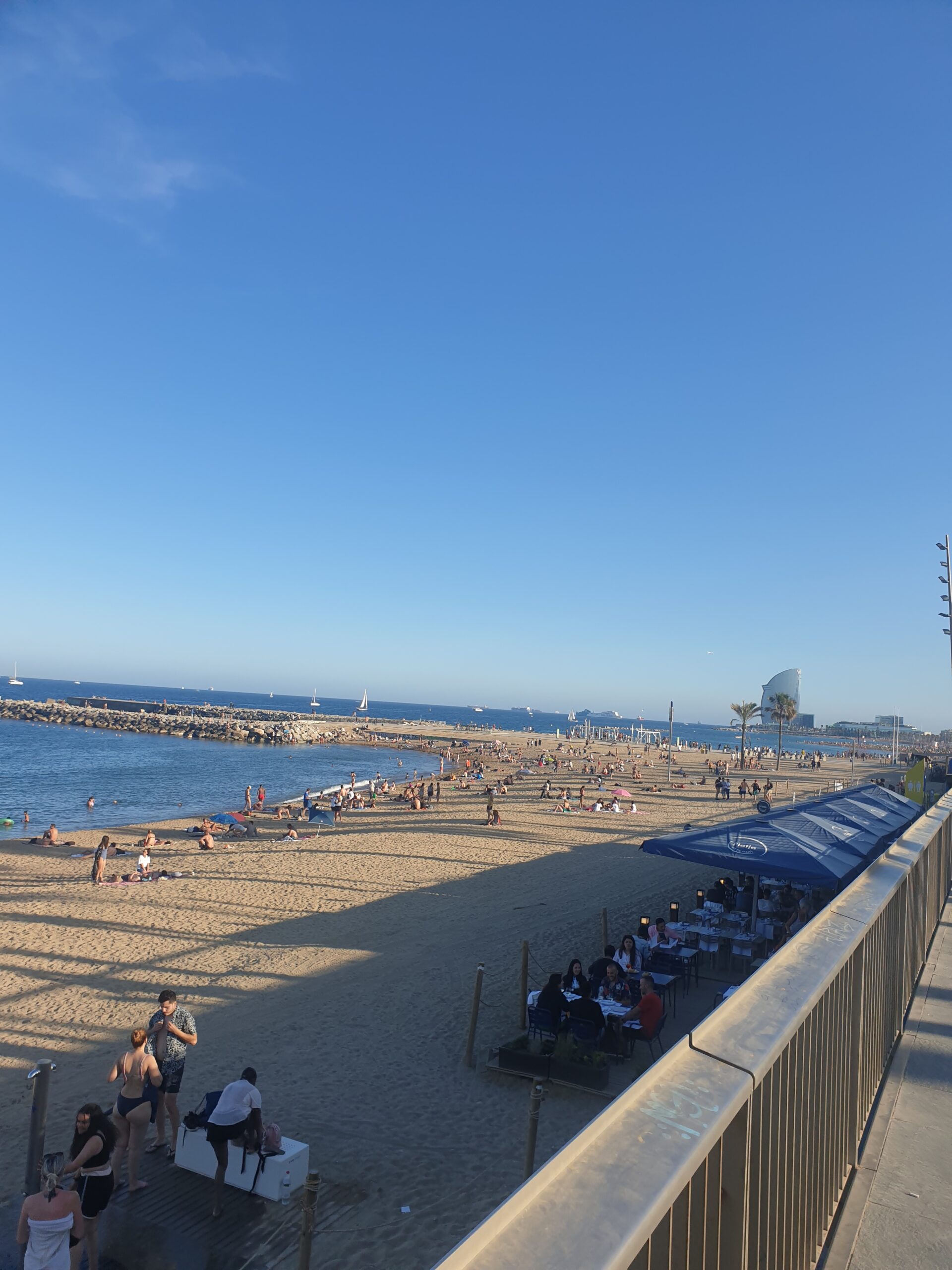 Barcelona nu este numai o destinatie excelenta de city break. Ci poate fi si o destinatie la plaja. In unele cazuri nu mai scumpa decat Mamaia. O plaja accesibila din zona fostului sat olimpic este Nova Icaria. In fapt un mic golfulet dincolo de portul olimpic. Nisip fin, dar intrare cam abrupta in apa. Bonus cateva pietre. O plaja mai celebra este desigur Barceloneta. Situata mai aproape de Rambla si accesibila si cu metroul. Mai lunga si mai bine amenajata. Cu dusuri si alte facilitati. Personal mi s-a parut mai aglomerata si mai murdara… Intrarea in apa tot abrupta, dar fara pietricele.